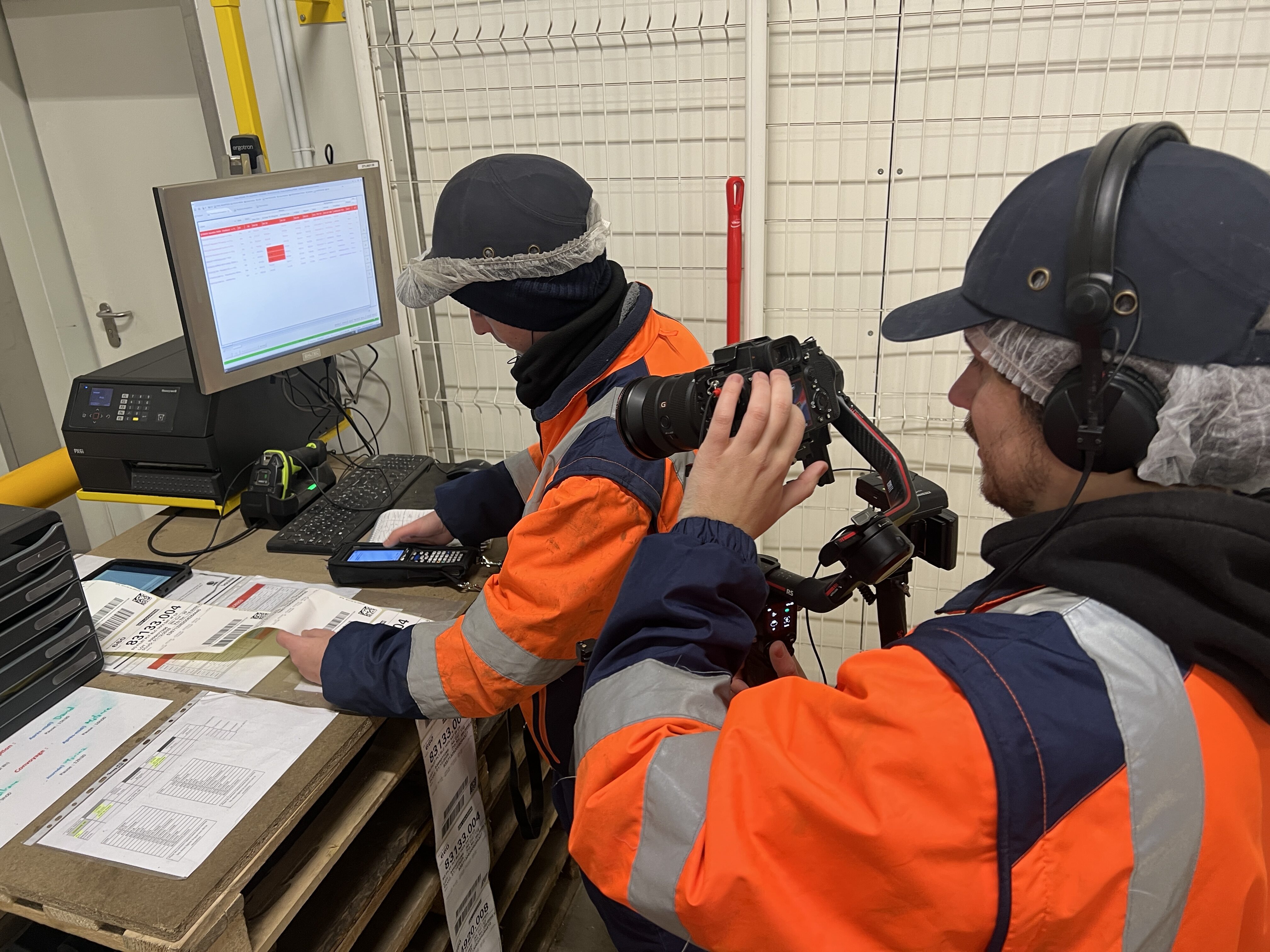 Valentin s’occupe également des emballages. Il gère les « balles » (glassine, carton, plastique) et les palettes cassées provenant de toute la plateforme, du nettoyage de sa zone et du nettoyage extérieur. Entre deux camions, il prépare ses palettes retours (colis en DLS, colis barquette cassées, poids erroné, etc.) Ensuite, je scanne avec lui tous les colis grâce à un terminal (appelé aussi TID), pour pouvoir sortir une étiquette de palette retour. On filme la palette si nécessaire et on la met de côté en attendant de pouvoir la charger dans le camion correspondant.